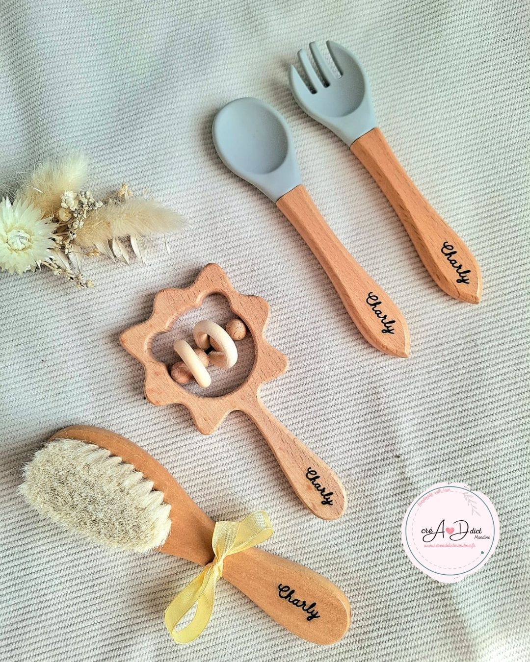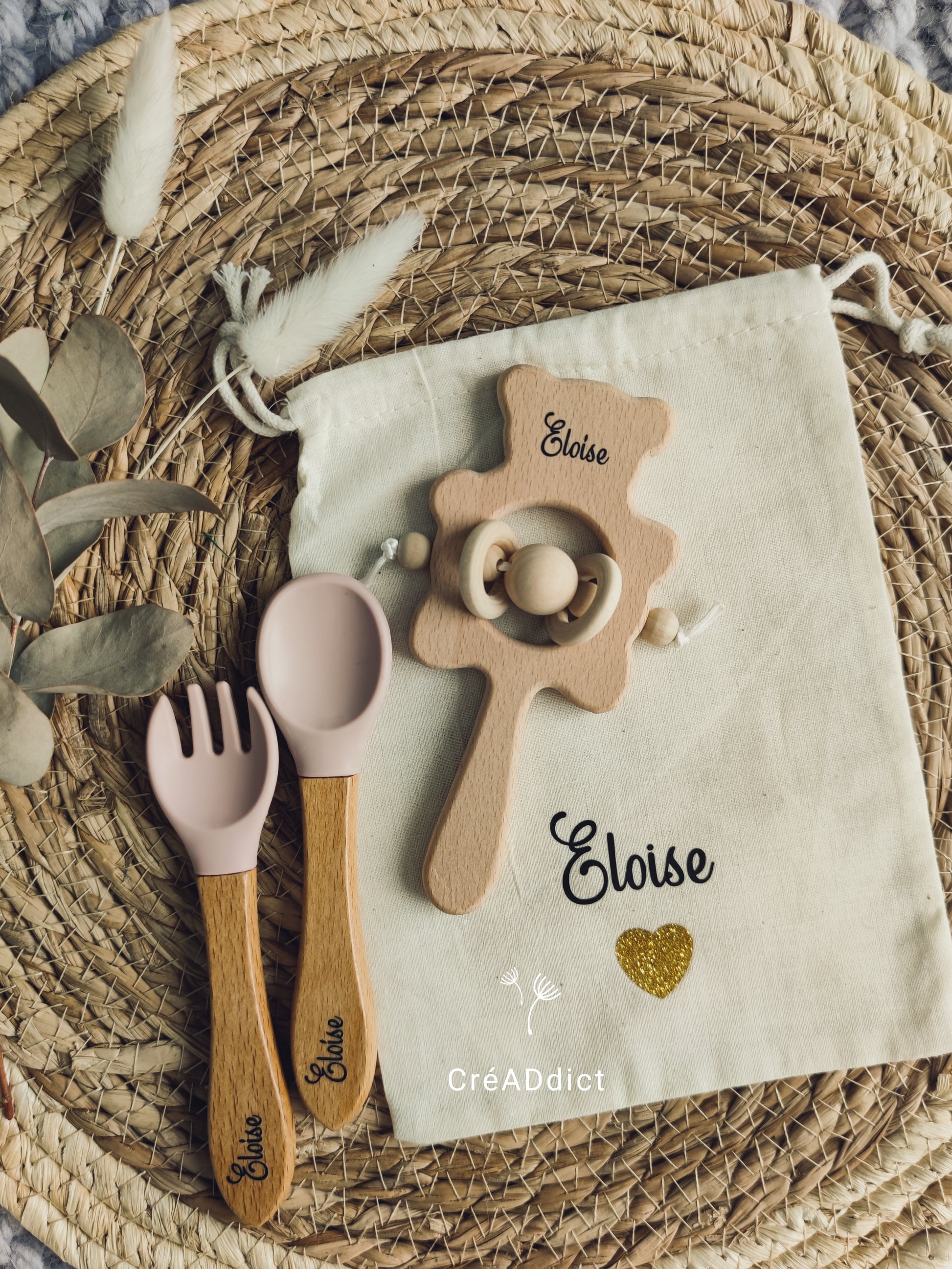 - Coffret 1 : Les couverts, un pochon en toile, le hochet et la brosse