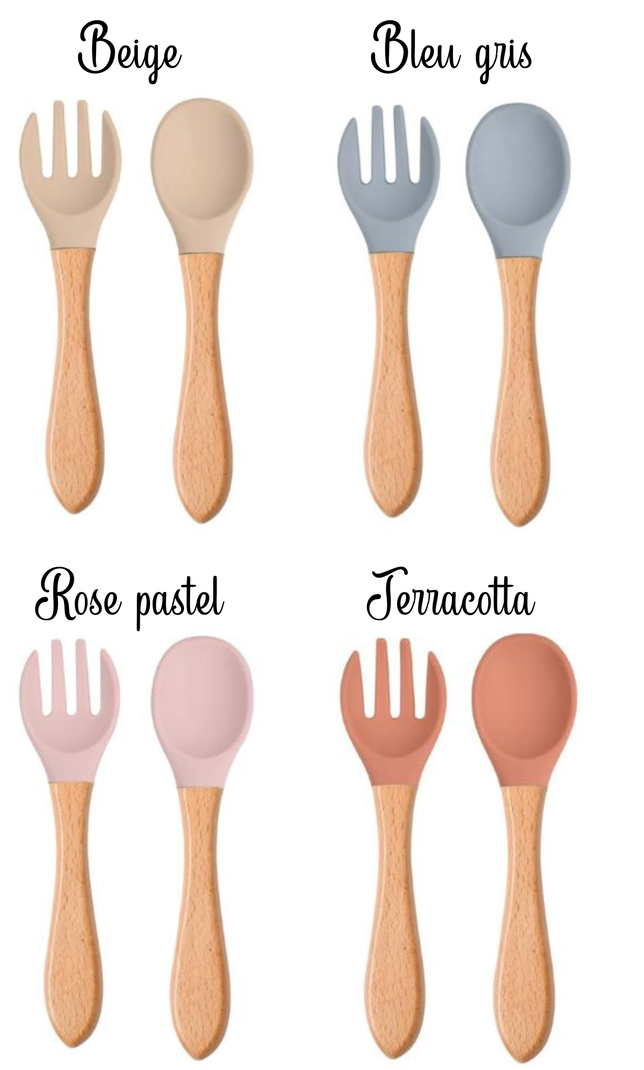 - Coffret 2 : coffret 1 + l'attache tétine et le bavoir en coton. La couleur des accessoires est assortie à la couleur des couverts choisi