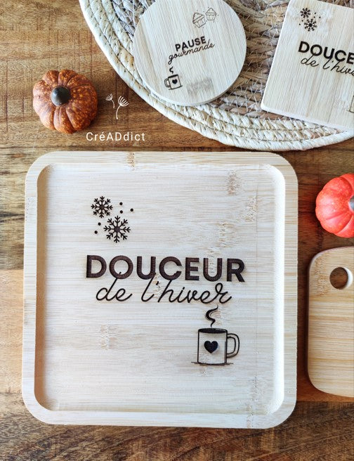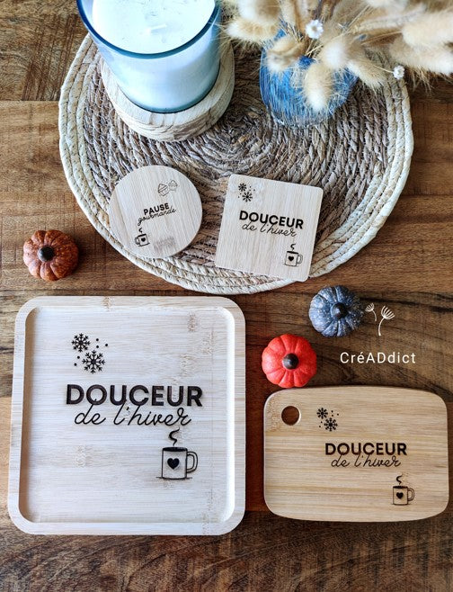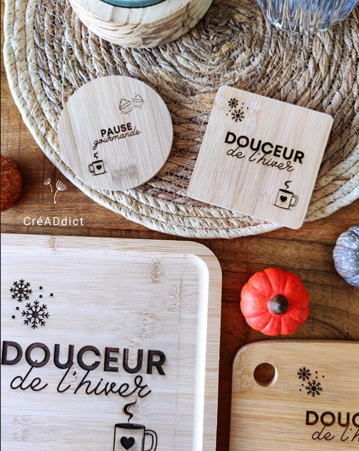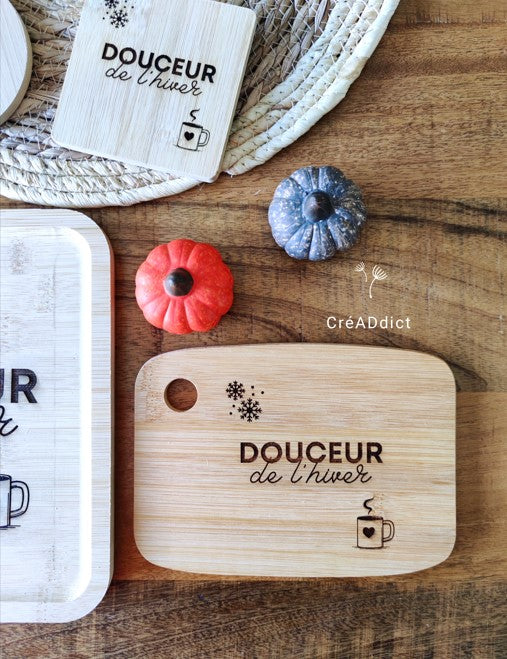 Planche apéro, plateau bois ou dessous de verres, à vous de choisir votre format et personnalisez-le avec le texte de votre choix.